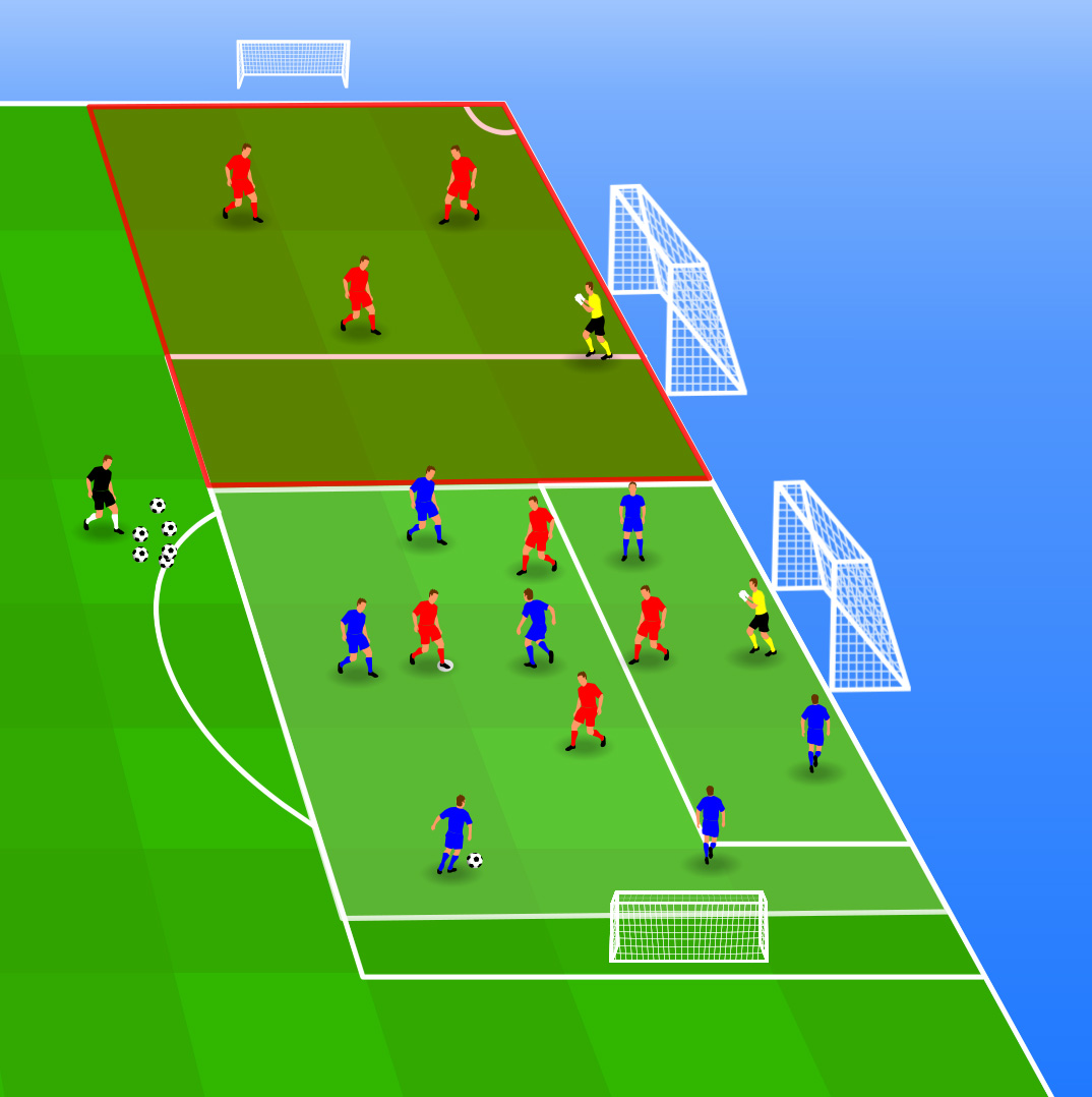 - Depending on where the ball is, the players around the center box must move along to get the best starting position. This way they learn to keep an eye on the ball in case blue can still attack outside the box and they will not only focus on attacking after conquering.