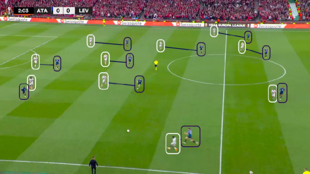 The most classic way of defending is man-marking: each player simply marks a direct opponent. This is often used by Atalanta Bergamo, for example, in the Europa League final against Bayer Leverkusen (Figure 1). In this situation, every Atalanta player simply ensures that their direct opponent doesn't get time and space.
