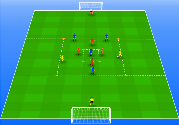 This exercise starts with a position game in the middle of the pitch. From there, the attack can take place towards both sides. In the image, the blue team is in possession of the ball. One player of the blue team will enter the small square in the middle. Both yellow and red players are not allowed to enter the small square in the middle. When blue has passed the ball to the player in the small middle square, they can score on both sides of the pitch. Again, players can be offside in the attacking areas.