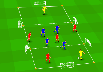 10 playersa section of 12m by 22m, divided into 3 sections8 cones6 mini-goals10 bibsenough balls