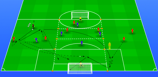 In this form, the cross comes from the other side than where the attack starts. The two players who start the attack are in front of the goal. The defender therefore also starts on that side. Th...