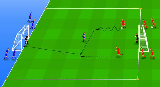 the drill starts with 2v1 in the advantage of the red teamafter the red team shot, 1 red player...