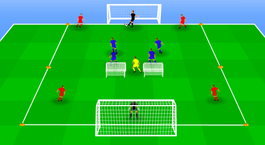 9 players and 2 goalkeepers6 cones9 bibs4 small goals2 big goalsenough balls