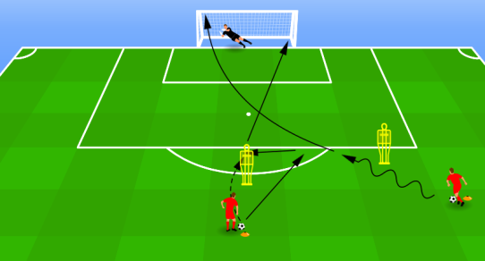 player 1 dribbles towards the mannequinhe dribbles past the mannequin and finishes outside of the bo...