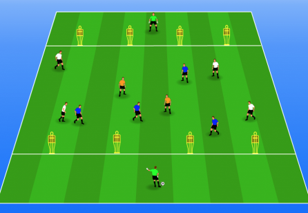 a field with a central section of 12 by 12 to 15 by 15 meters2 end sections with a length of 5 to 6 meterspossibly 4 mannequins on the lines between 2 sectionsenough bibs, cones and balls